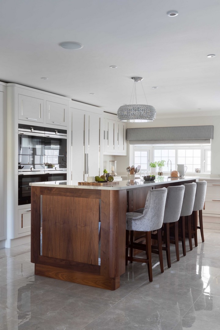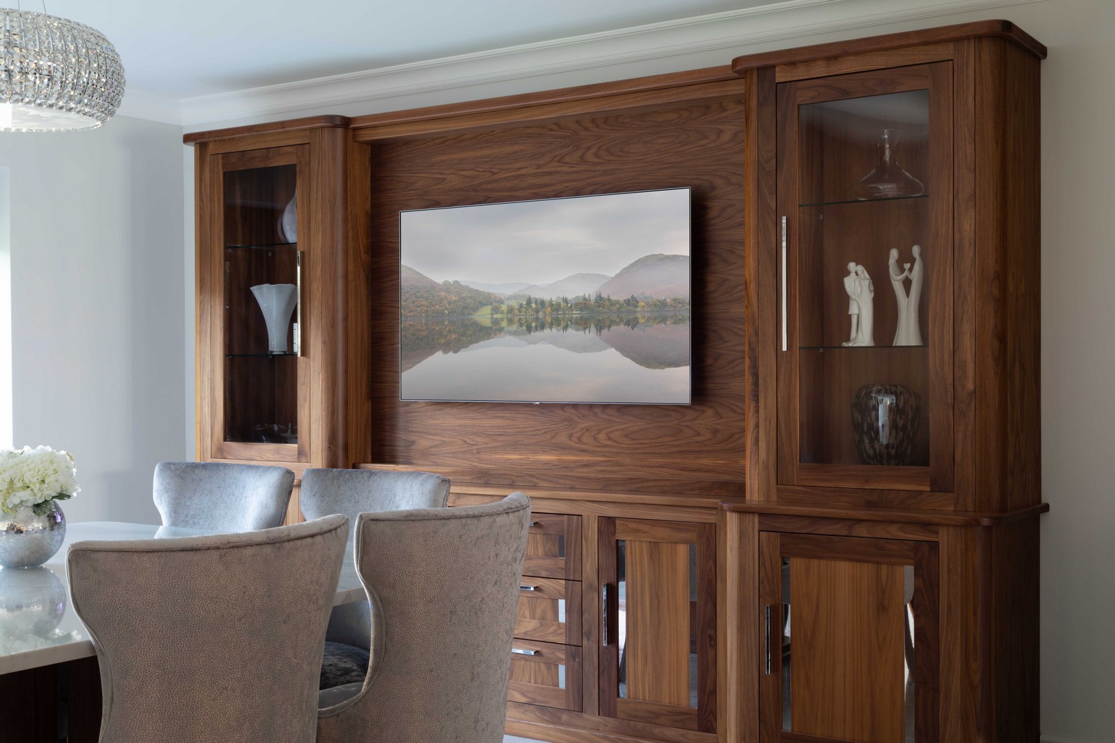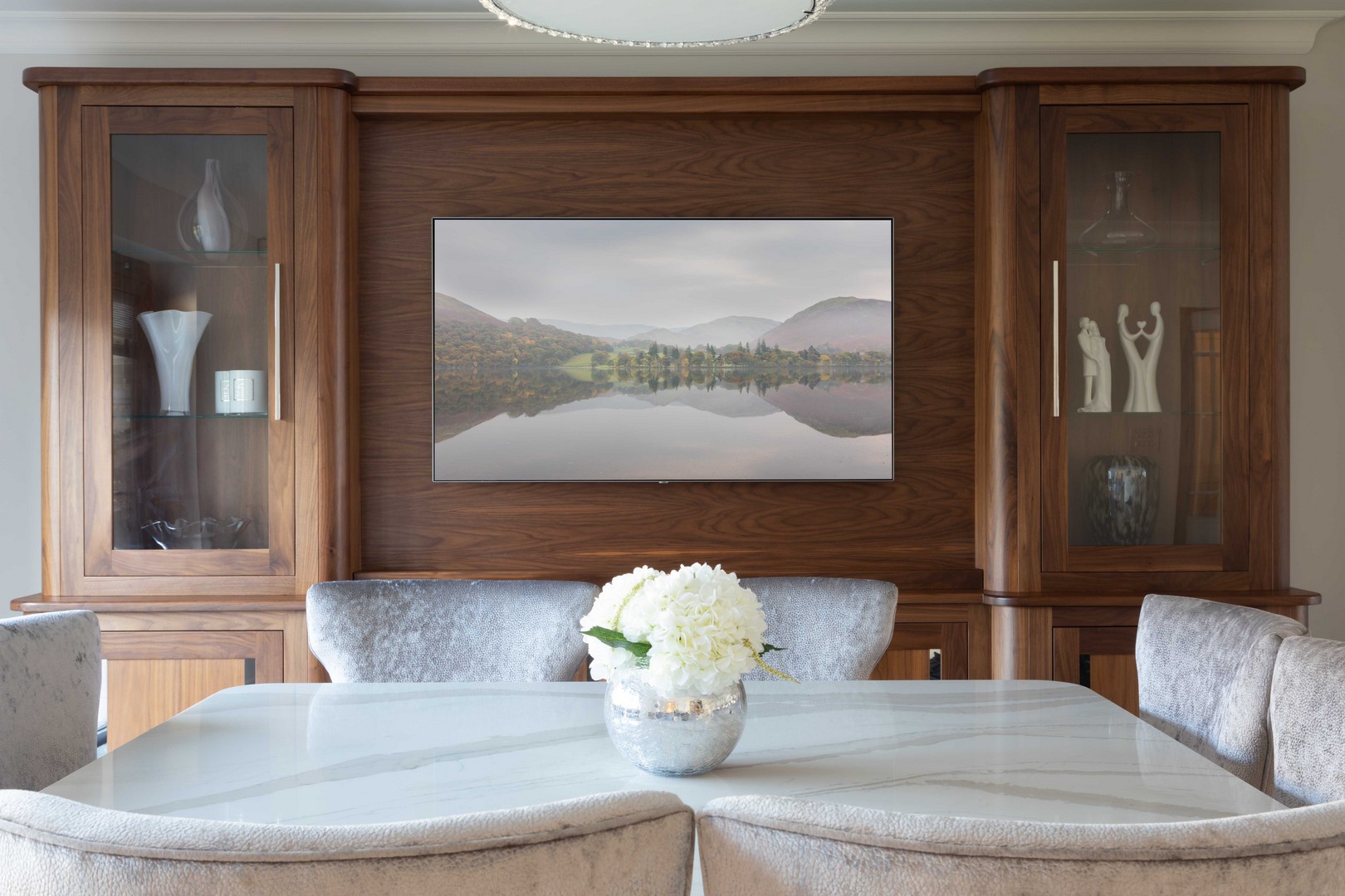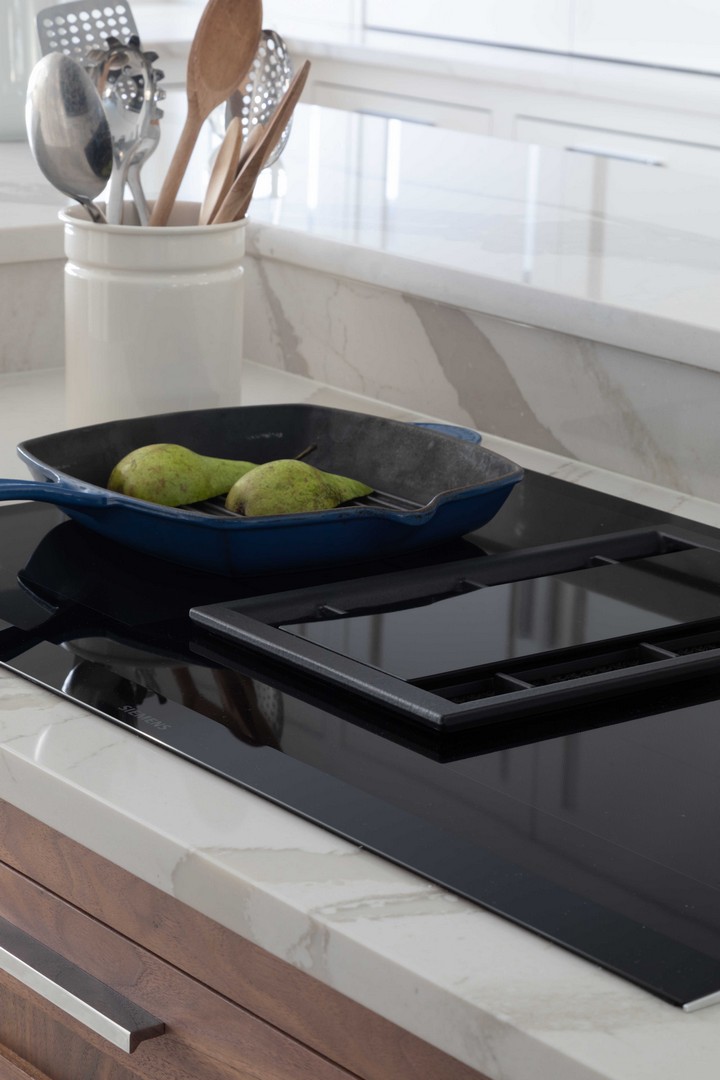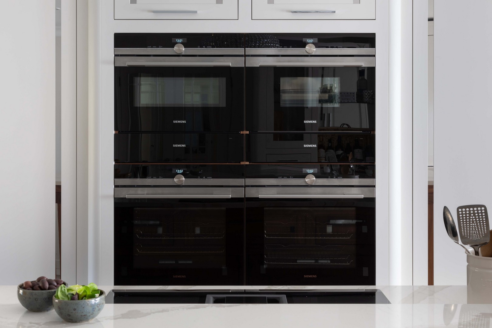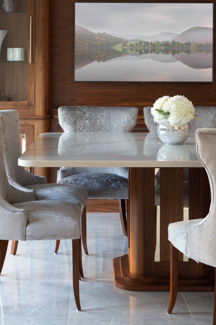 A truly special kitchen with modern yet elegant furnishings. Fitted with Siemens appliances and cabinetry with stainless steel inserts and rounded edges to maintain a sleek look. The American black walnut and steel inserts that are also part of the dining table and media wall, allows for the space to perfectly flow into the dining room from the kitchen.