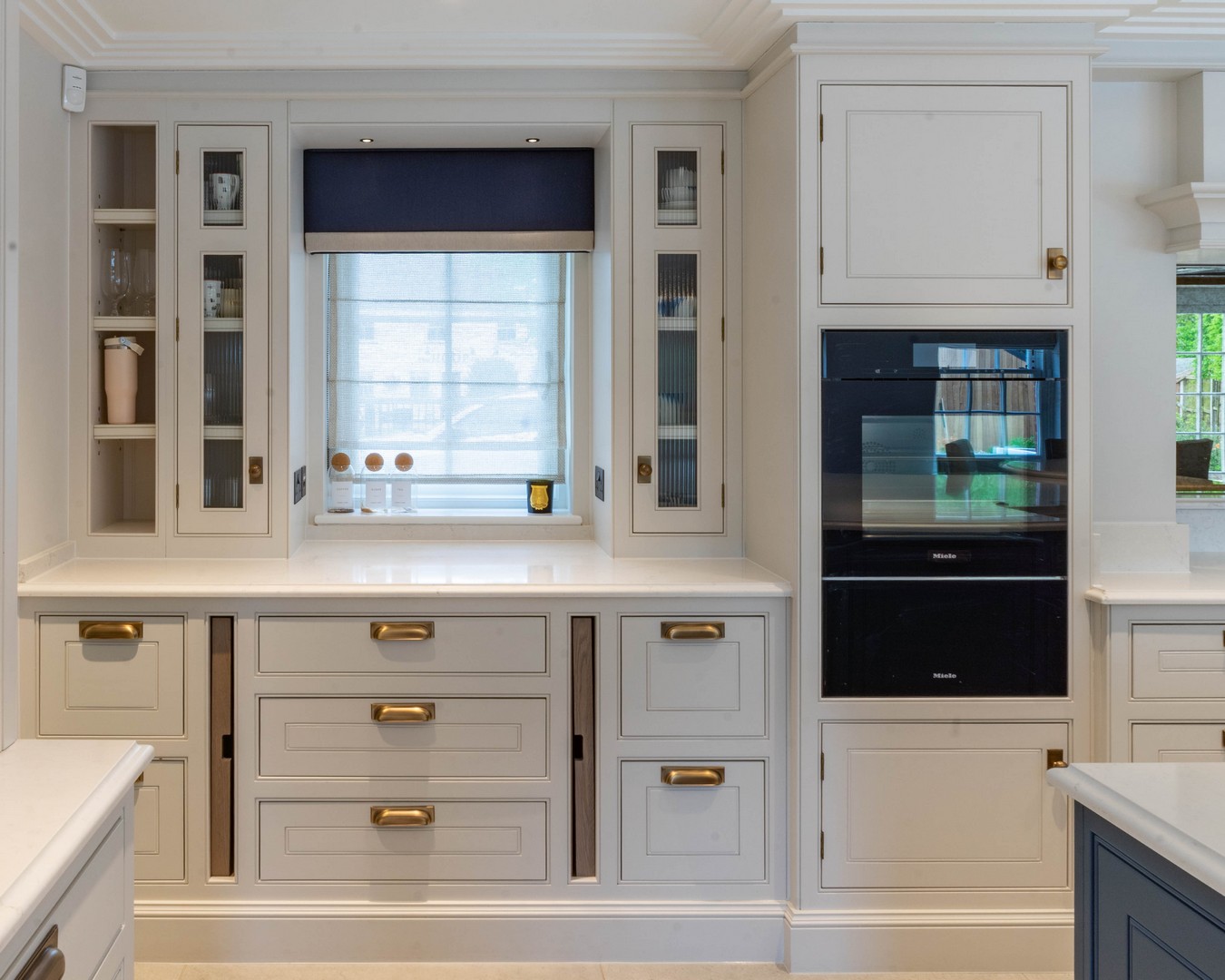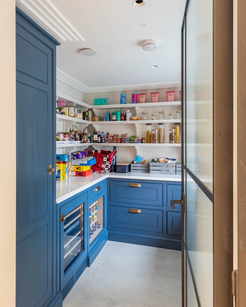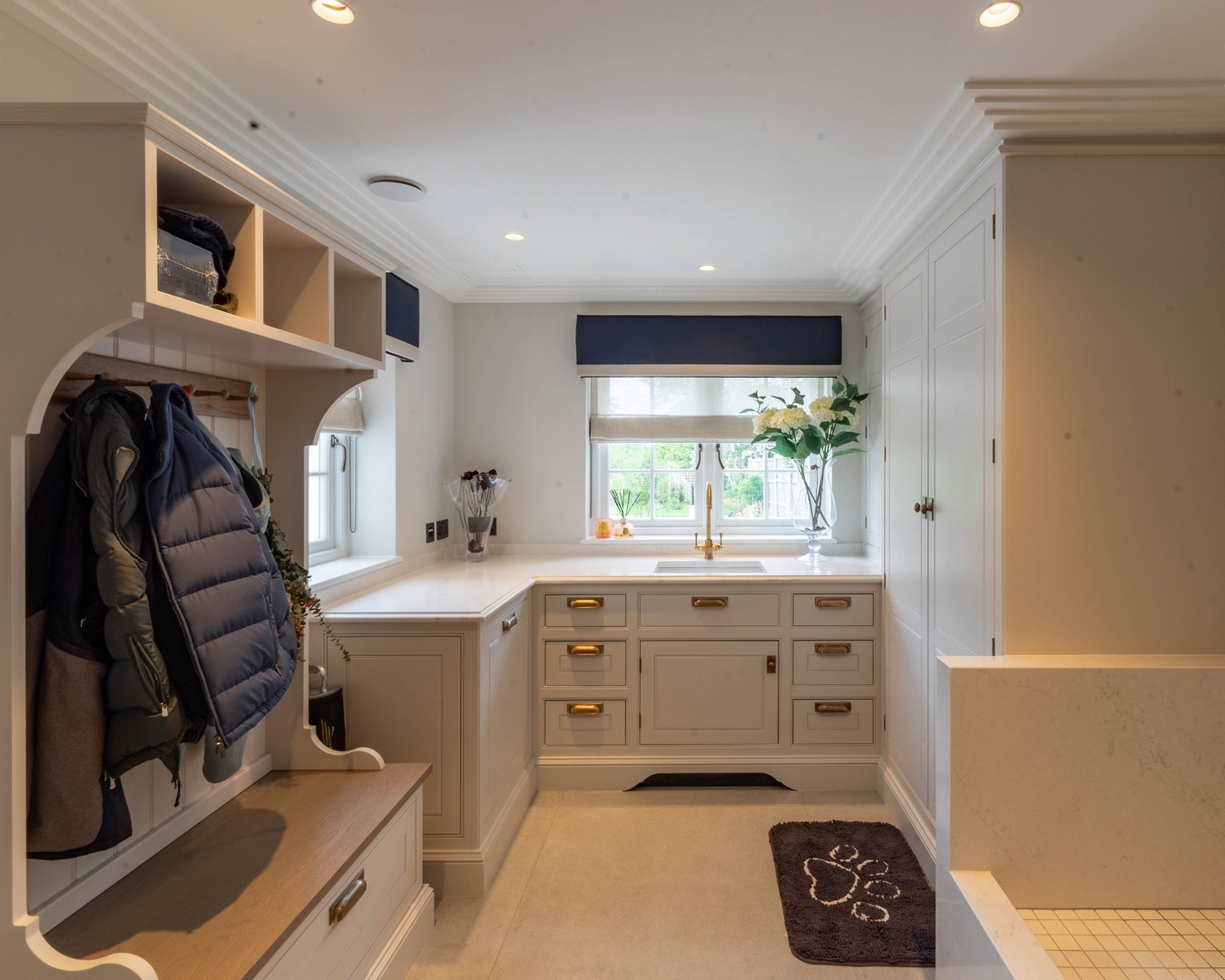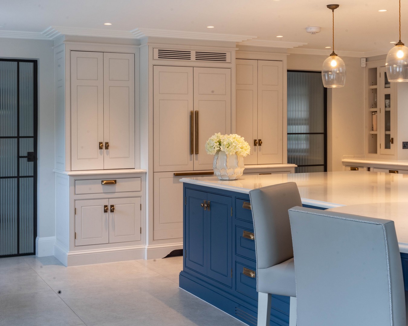 A beautifully curated project in a luxury home, featuring a bespoke kitchen, pantry, boot room and utility — all handcrafted by Crabtree & Hargreeves. This timeless scheme pairs Farrow & Ball’s Clay Pale cabinetry with a contrasting Hague Blue island, brought to life with a beaded in-frame door style. Finished with elegant Calcott and Liberty handles by Hendle & Hendle, the result is a refined balance of function and understated luxury.