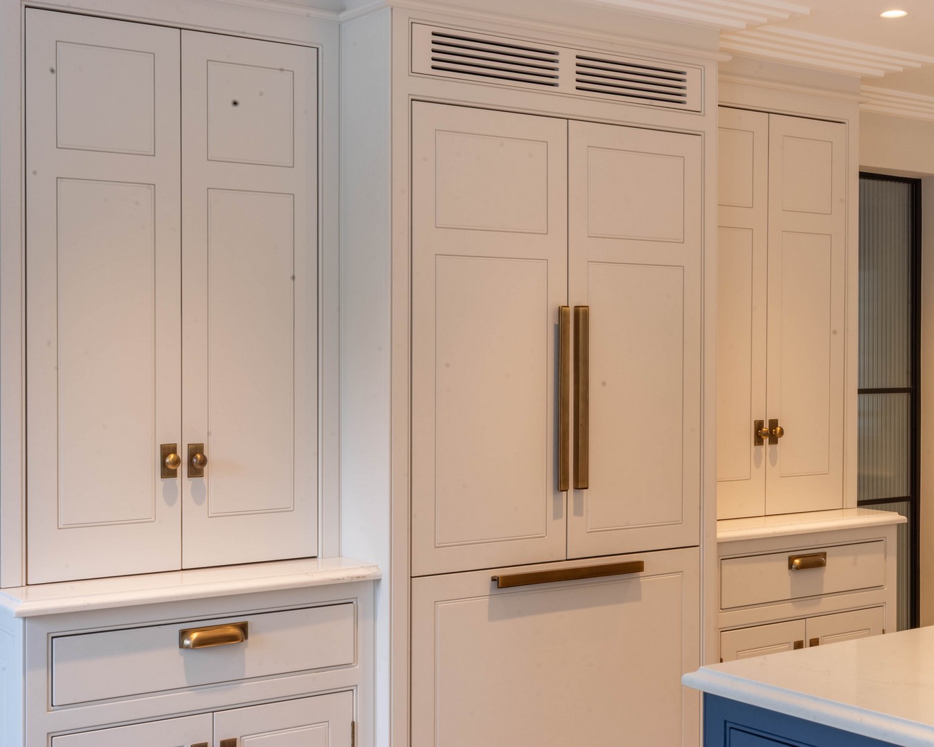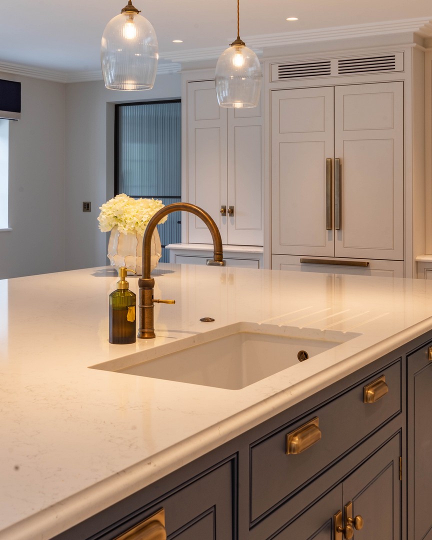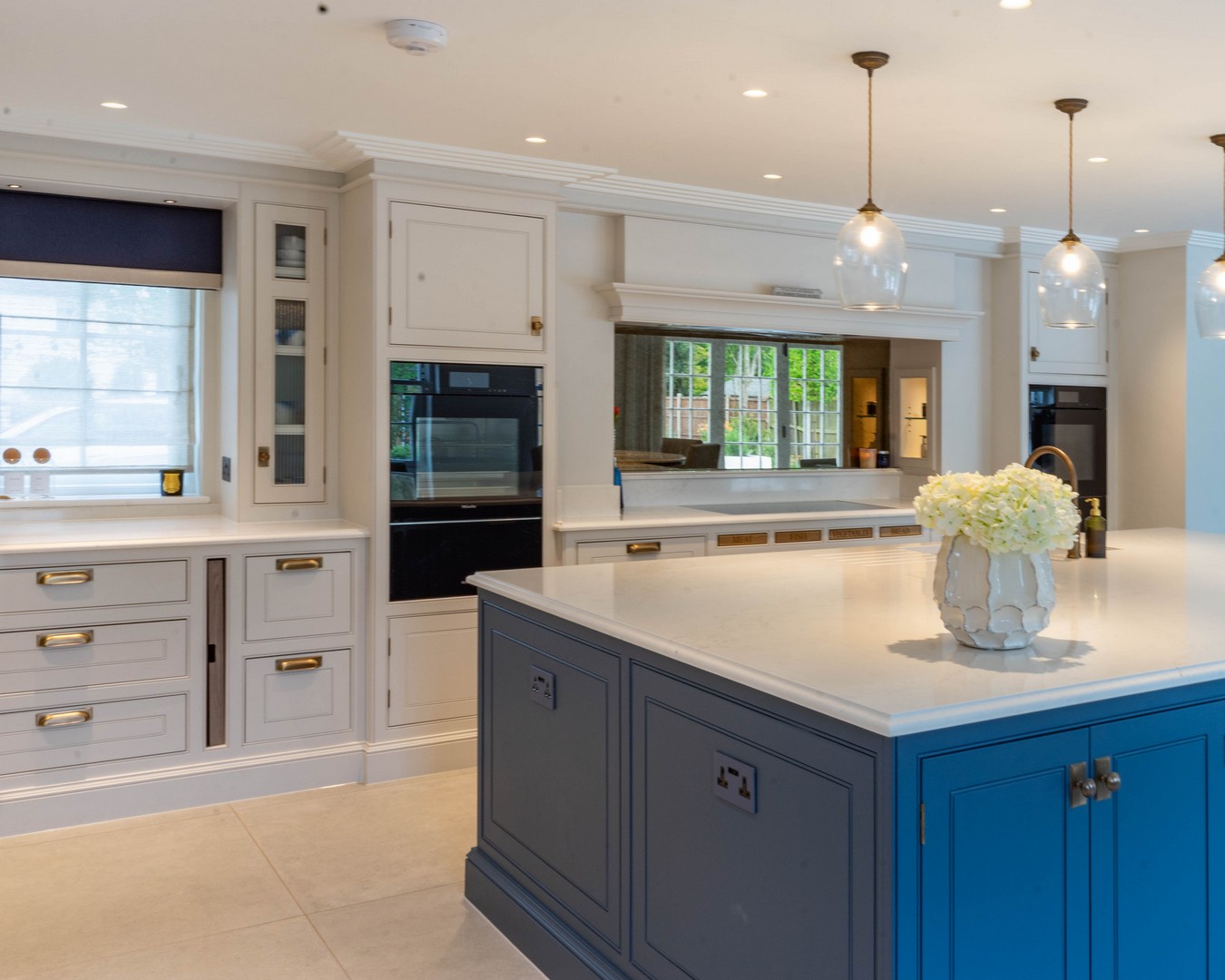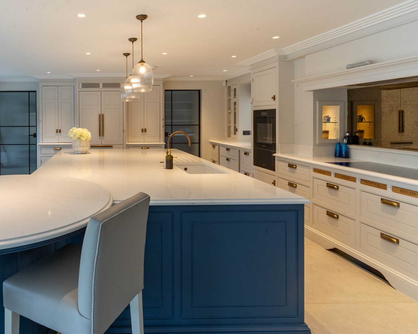 A beautifully curated project in a luxury home, featuring a bespoke kitchen, pantry, boot room and utility — all handcrafted by Crabtree & Hargreeves. This timeless scheme pairs Farrow & Ball’s Clay Pale cabinetry with a contrasting Hague Blue island, brought to life with a beaded in-frame door style. Finished with elegant Calcott and Liberty handles by Hendle & Hendle, the result is a refined balance of function and understated luxury.