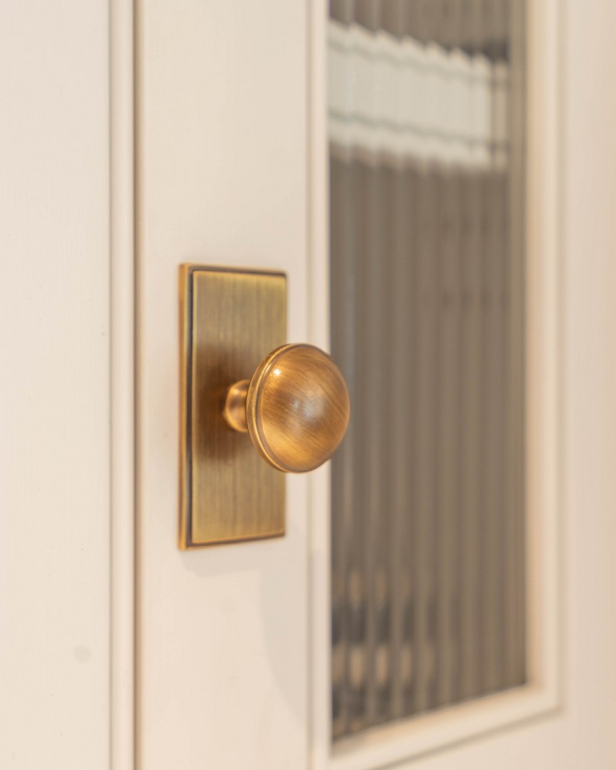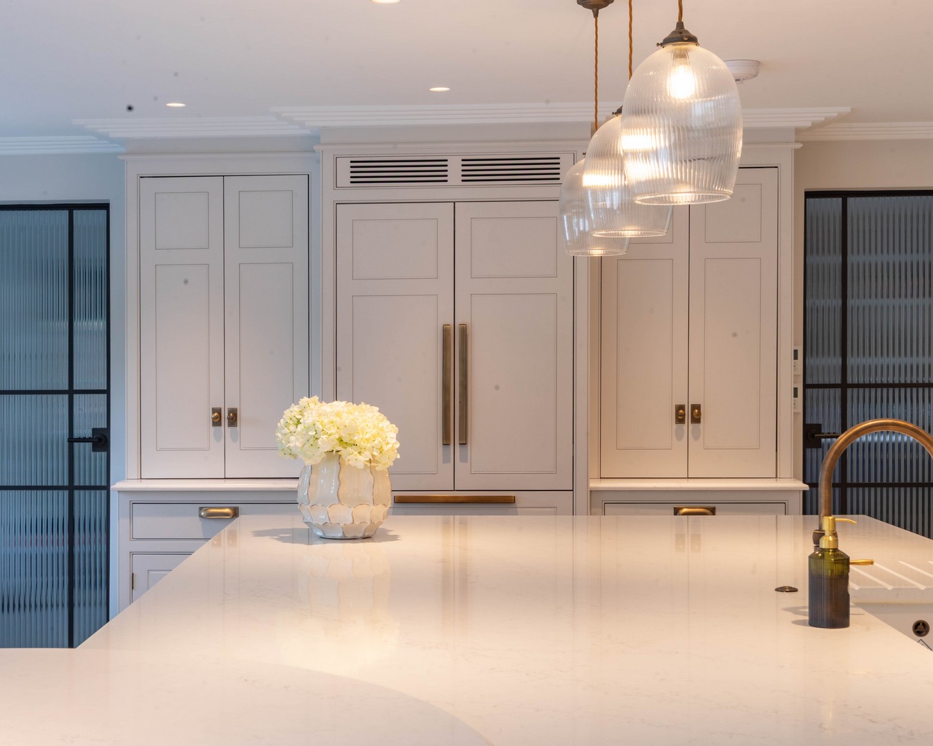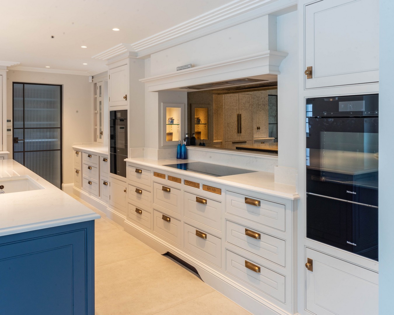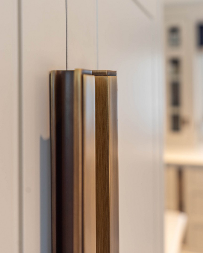 A beautifully curated project in a luxury home, featuring a bespoke kitchen, pantry, boot room and utility — all handcrafted by Crabtree & Hargreeves. This timeless scheme pairs Farrow & Ball’s Clay Pale cabinetry with a contrasting Hague Blue island, brought to life with a beaded in-frame door style. Finished with elegant Calcott and Liberty handles by Hendle & Hendle, the result is a refined balance of function and understated luxury.